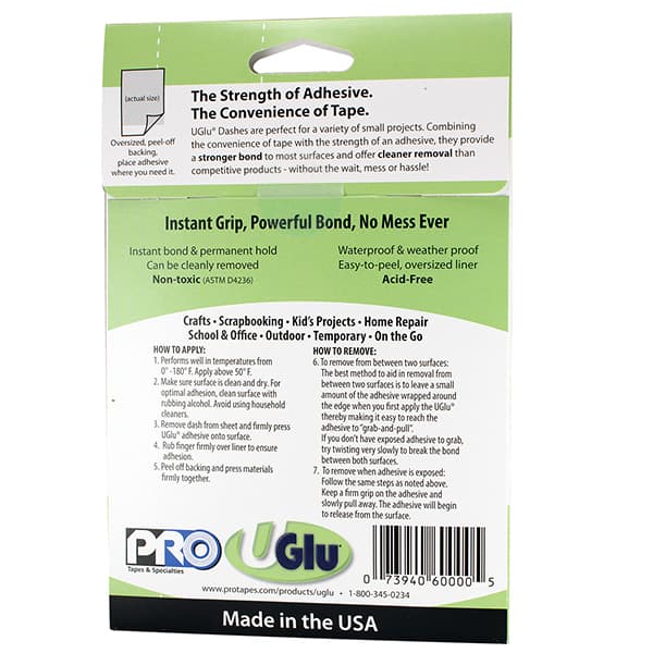 PRO UGLU DASHES. These UGLU Dash Sheets Features 20mil Rubber Based Mounting Adhesive Squares 1/2 Inches x 5/8 Inches On Sheets Approx 160 Dashes. These Acid Free, VOC Free And Totally Green Product Has Instant Bond And Permanent Hold And Can Be Cleanly Removed. The UGLU Dashes Tapes Can Bond To Foil, Latex Paper, Wood, Tile Metal And Many More.