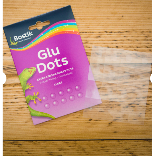 Bostik Extra Strong Glu Dots are circles of clear, strong glue that stick to almost anything including paper, wood, plastic, foam, metal, glass and painted surfaces.