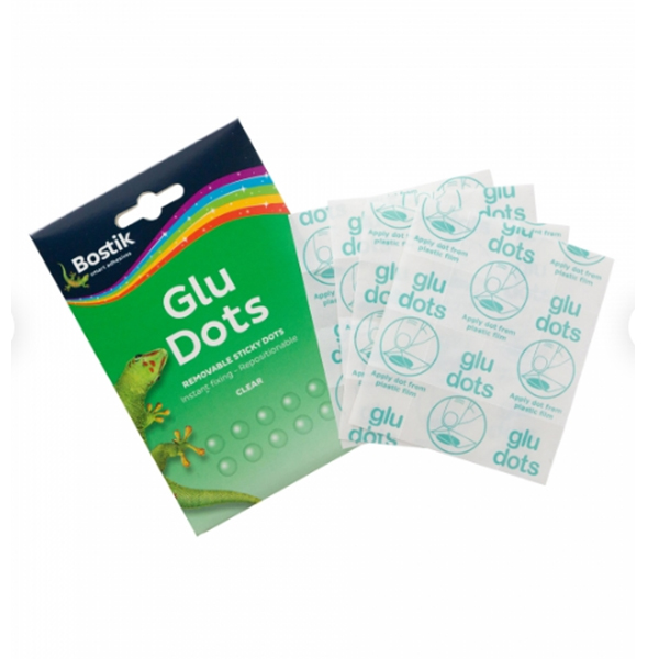 Bostik Removable Glu Dots are circles of clear, removable glue that stick to almost anything, including paper, wood, plastic, foam, metal, glass and painted surfaces.