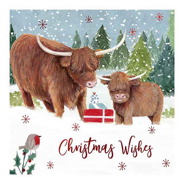 These charming Christmas cards feature two assorted Highland Cow designs, bringing a touch of rustic winter cheer to your holiday greetings. Each pack includes 12 cards (6 of each design), perfect for sending warm wishes to family and friends this festive season.