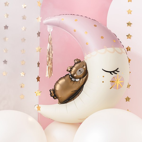 Teddy On The Moon With Light Pink Elements And Tassel Gold Detail Wholesale Supershape Foil Balloon.