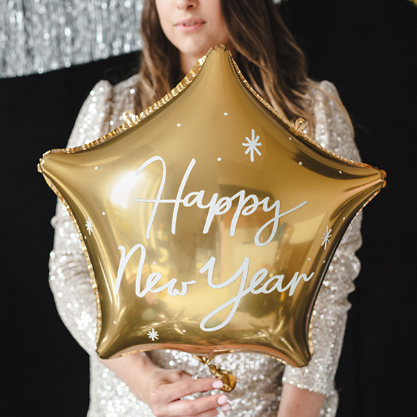 PartyDeco Happy New Year Glossy Gold Star Shape With White Inscription Wholesale Foil Balloon.