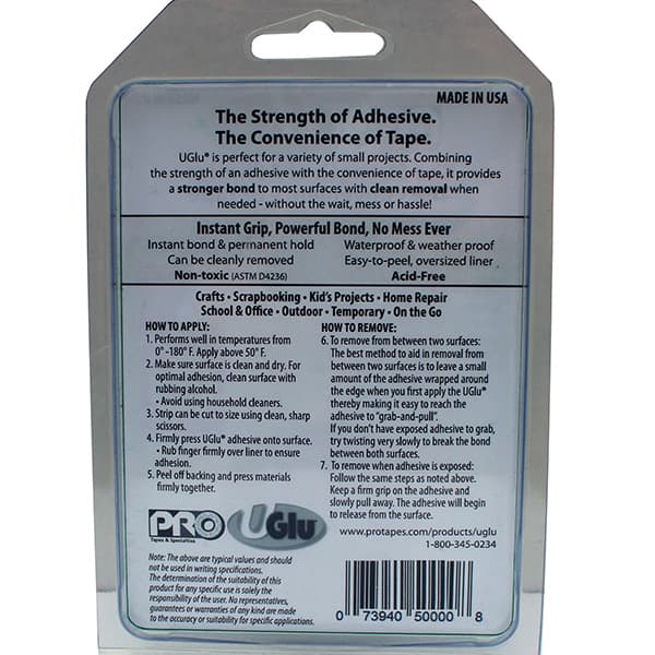 Application:Mounting, bonding, securing, temporary holding and carpet installation. UGlu is often used in the arts & crafts industry. This product adheres well to all woods and metals. Not recommended for use on plastics.